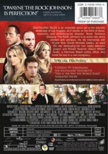 “Southland Tales” tells the story of four people with intertwining cosmically-influenced lives living in a post-apocalyptic Southern Californian landscape writhe with political, economic, and social turmoil. We follow the lives of Boxer Santaros (Dwayne Johnson), an action star suffering from Amnesia, Krysta Now (Sarah Michelle Geller), a former porn-star, and twin brothers Roland and Ronald Taverner (Sean William Scott). They are governed by an expanse of the patriot act called US-IDENT that monitors the citizens every move. Additionally, an attempt to create a new fuel source brings about “Liquid Karma” whose use sends Earth into an uncontrolled spiral through space and time. One night the destiny of all mankind will be decided forever.